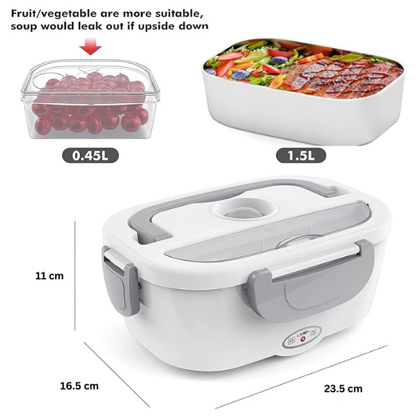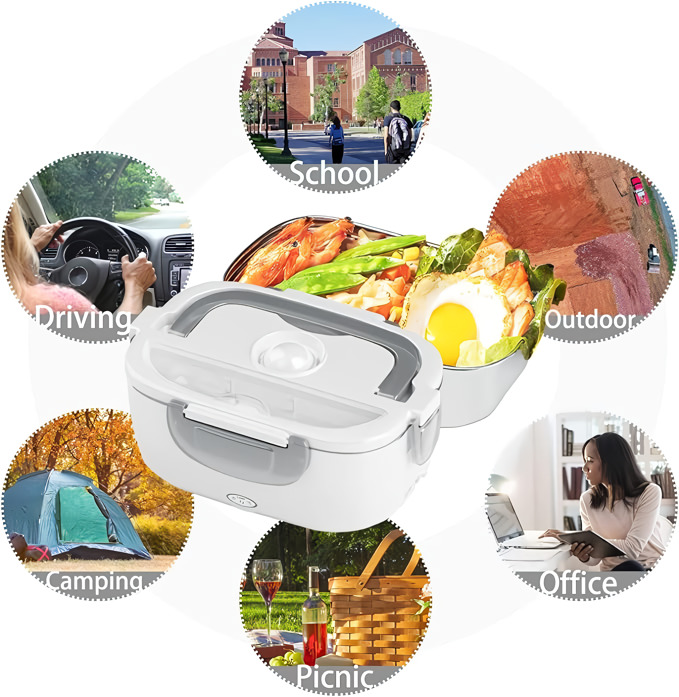 Dva uklonjiva PP odeljka drže vaše glavno jelo i prilog odvojenim – a oba idu pravo u mašinu za sudove nakon toga. Radi u kancelariji, u automobilu, na gradilištu ili u bilo kojoj prostoriji sa strujnom utičnicom.
