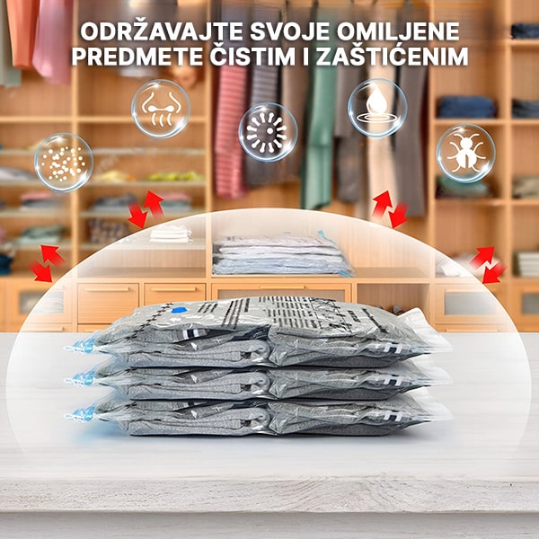 Ponestaje vam mesta u ormanu? Mučite se da spakujete sve u kofer? VACKBAGS vakuumske kese za odlaganje komprimuju vaše glomazne predmete do 80%, dajući vam trenutni prostor za ono što je važno. Jednostavno spakujte odeću ili posteljinu, zatvorite kesu i upotrebite bilo koji kućni usisivač da izvučete vazduh – traje manje od 60 sekundi. Više prostora, manje nereda, nula muke.