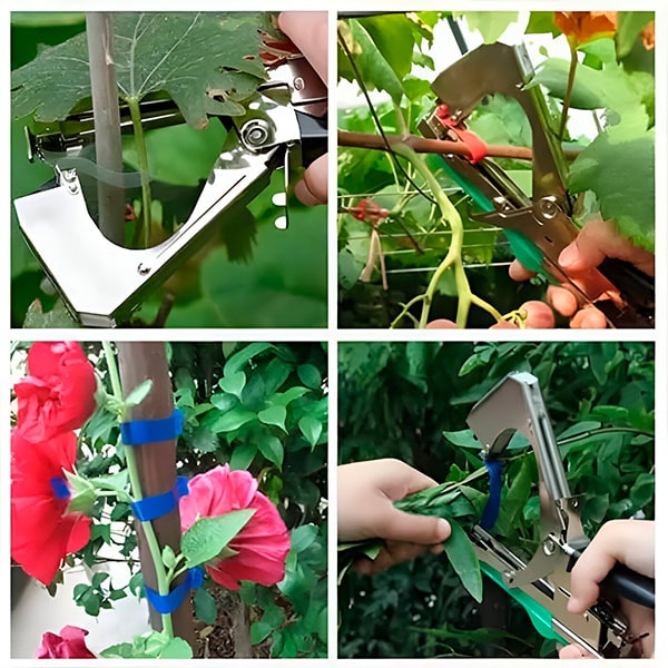 Dovoljno je pritisnuti ručku da biste razvukli traku između klješta. Traka se zatim obavija oko biljke koju želite vezati. Ponovno pritisnite ručku da zategnete i prerežete traku. Veoma lako! – bez brige o oštećenju vaših biljaka ili nanošenju bola, jer traka i heftalica pružaju nežan ali čvrst stisak.
